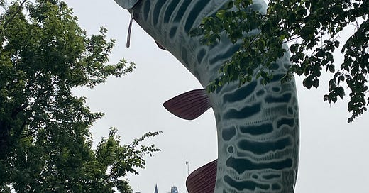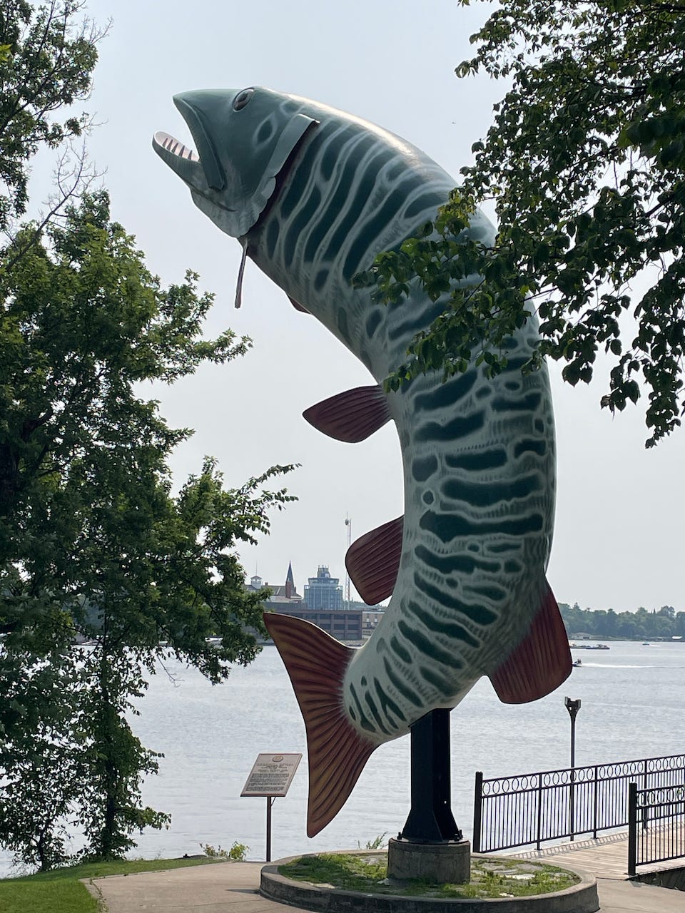 Our first day was full of doing errands (but also returning to Iron and Clay for a coffee). On Sunday we had a delicious brunch at The Hungry Pug Cafe, which was well worth the wait in line. Then we walked around the bay to see “Huskie the Muskie”: